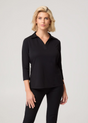 The Women's Ella 3/4 Sleeve Polo Top offers a versatile fit that is both comfortable and elegant. With a body shape that allows for movement, this top can be worn tucked or untucked and is suitable for a variety of body types.