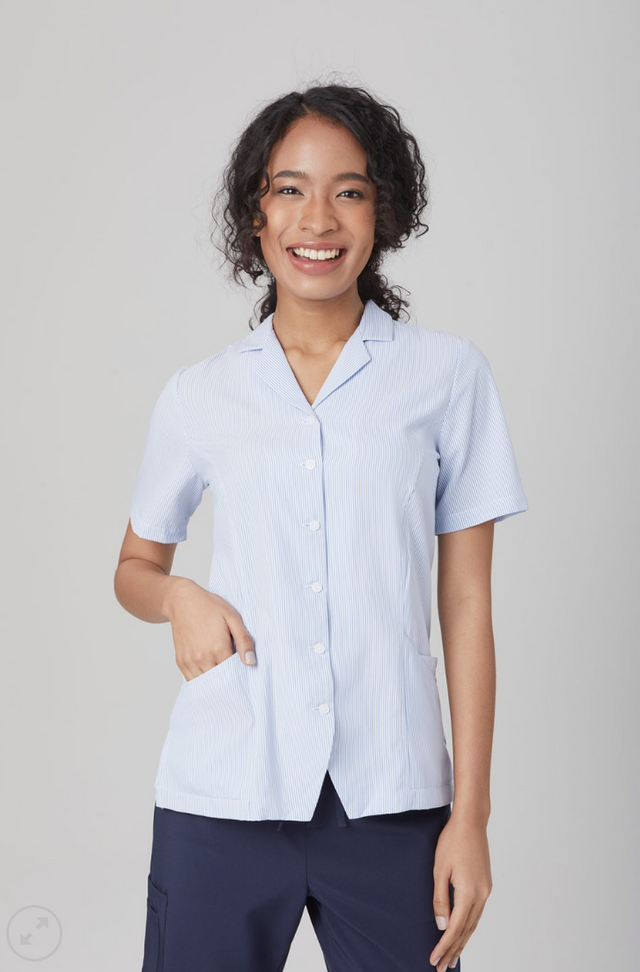 The Women's Ezylin Dual Pocket Stripe Shirt offers a relaxed fit that is straight through the body and longer in length, perfect for those with a fuller figure. Its dual pocket design adds functionality and style.