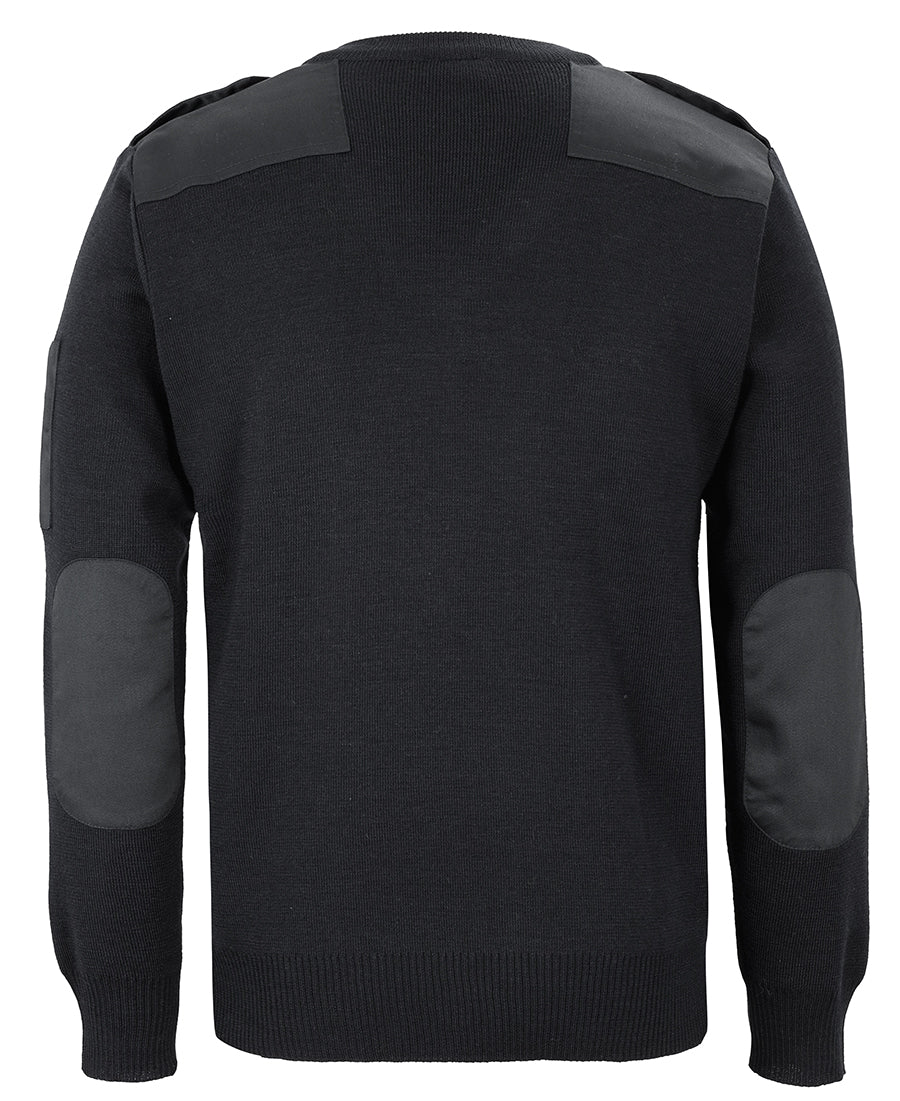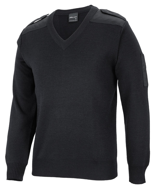 JBs Epaulette Jumper, a classic fit that combines 50% wool for warmth and 50% acrylic for easy care. This jumper features woven epaulettes with Hook-Pile Tape closure on both shoulders, as well as woven elbow patches and two woven patch pen pockets on the sleeve.