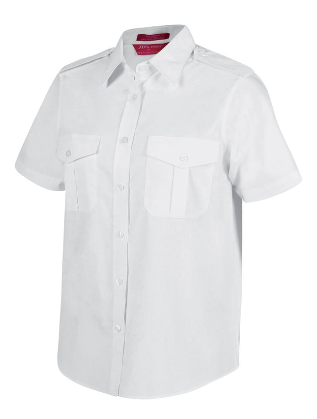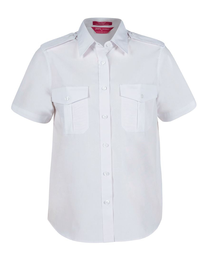 JBs Womens Epaulette Short Sleeve Shirt. Made with a 65% Polyester, 35% Cotton fabric, this shirt features a two-piece collar with collar stays, button-down epaulettes on both shoulders, and two reinforced chest pockets with pen inserts. With easy care fabric and a curved hem, this urban fit shirt is perfect for any professional setting.