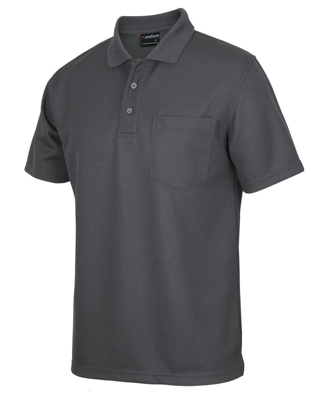 Podium Men's Waffle Pocket Polo. This classic fit polo is made from 100% durable polyester with a textured waffle knit fabric for added style. Stay cool and dry with Podium Cool™ moisture-wicking technology. Featuring a 3-button placket, chest pocket, flat knit collar and open sleeve cuff, and a straight hem with side splits.
